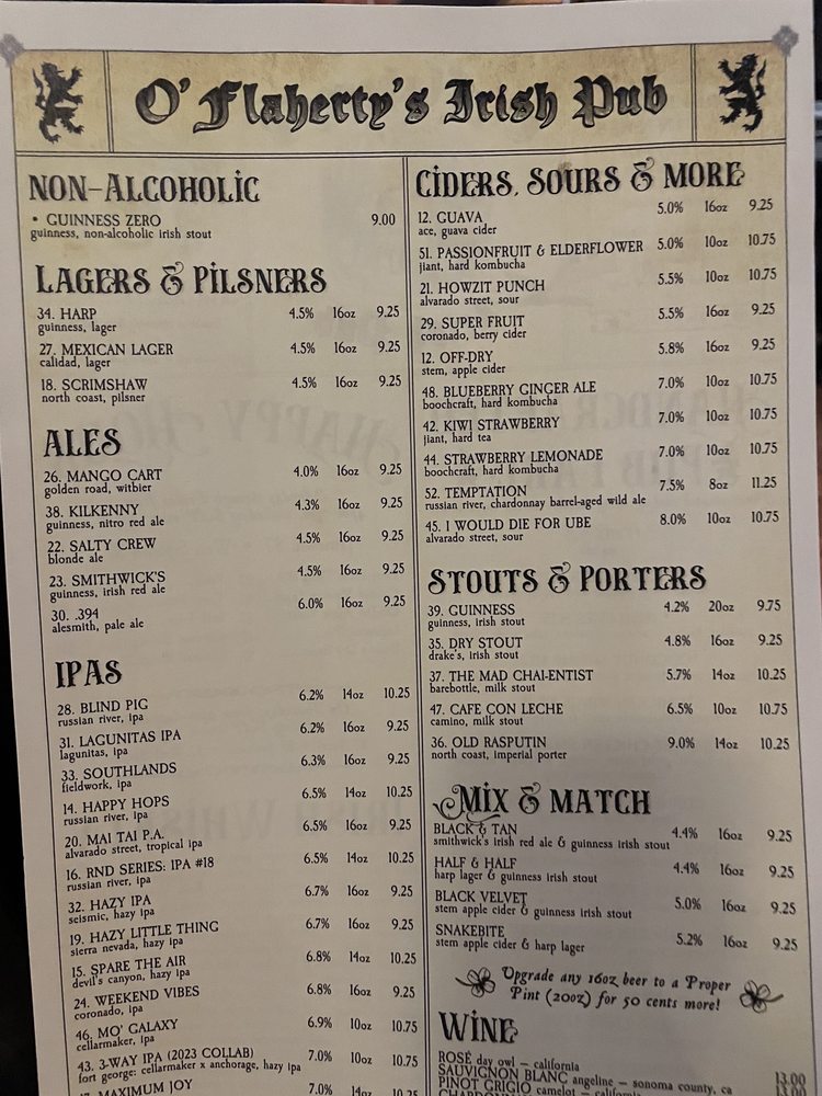 Welcome to O'Flaherty's Irish Pub, a cozy haven in San Jose, CA where vibrant flavors meet a lively atmosphere. This pub offers an extensive menu focusing on delectable American desserts and classic pub grub. Dive into their scrumptious Kennebec French Fries for just $6.50, or indulge in the rich Mac & Cheese with a blend of white cheddar and Parmesan for $11.75. Don't miss the mouthwatering Dungeness Crab Cakes, perfectly complemented by a tangy citrus vinaigrette at $15.00.